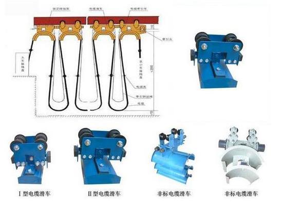 HC系列電纜滑車分為中載荷型、重載荷型、和輕載荷型,因此滑車走輪為Ф80、Ф63、Ф50的三種,承載能力≤50~150kg,每類按托板層數(shù)分為單層、雙層、三層,每類中有三種形式,首端為電纜牽引車,終端為固定掛線架,中間為電纜滑車。